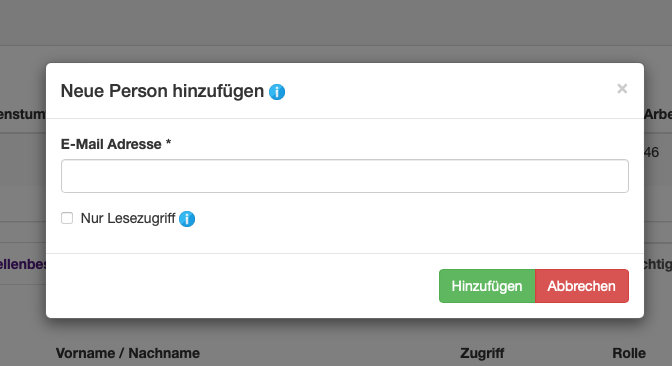 - Klicken Sie auf den grünen Button "hinzufügen". Die Person erscheint nun in der Liste der Zugriffsberechtigungen für Ihre Eingabedaten.